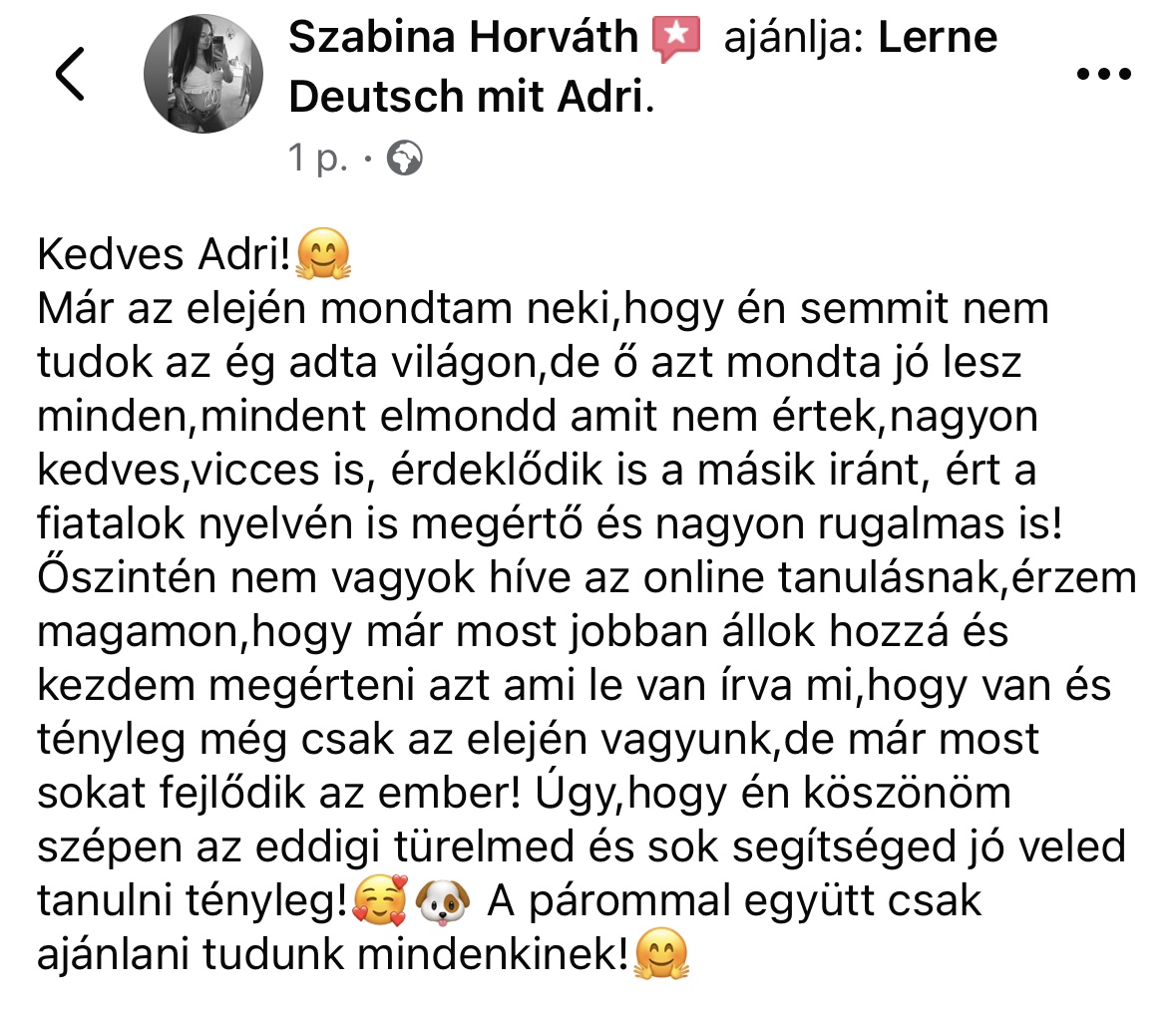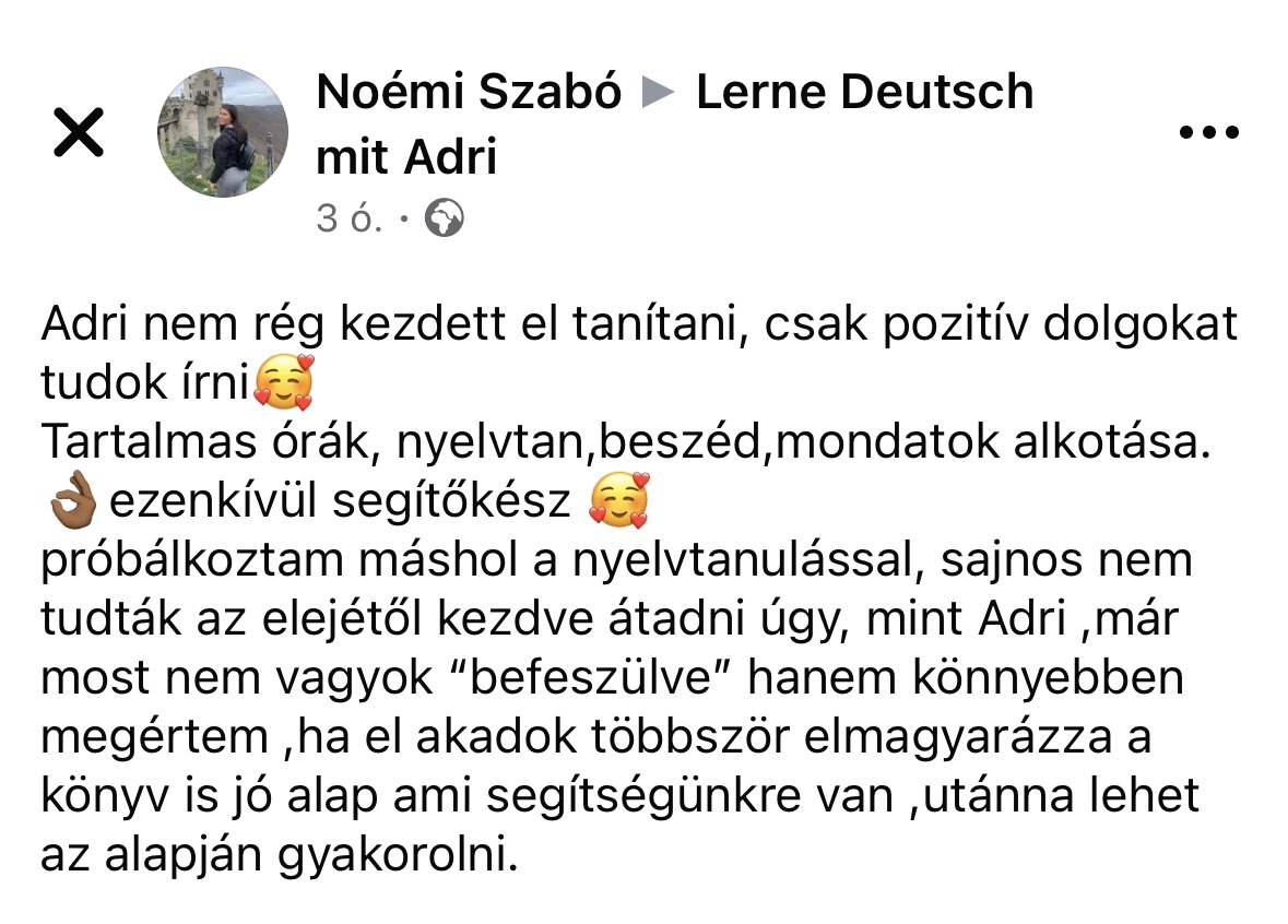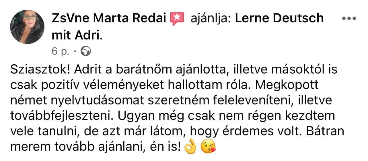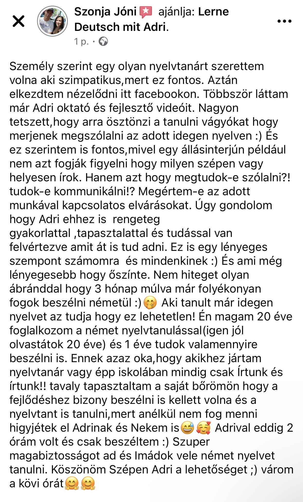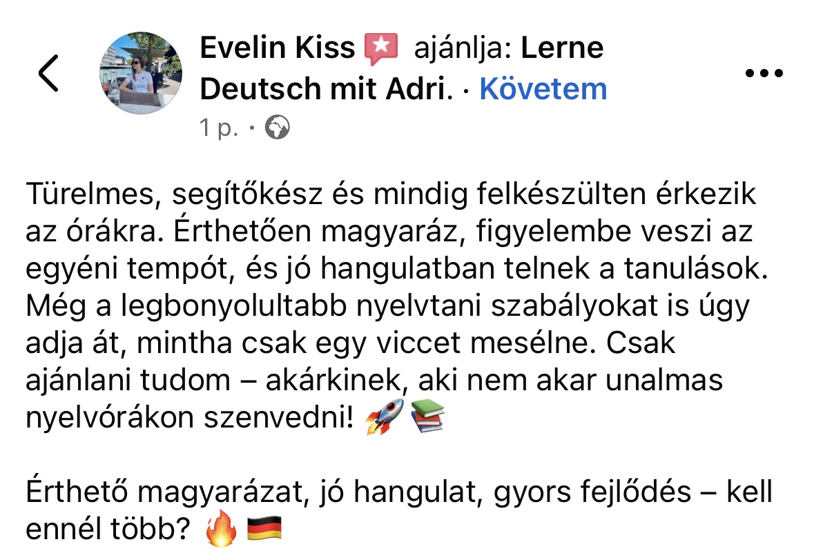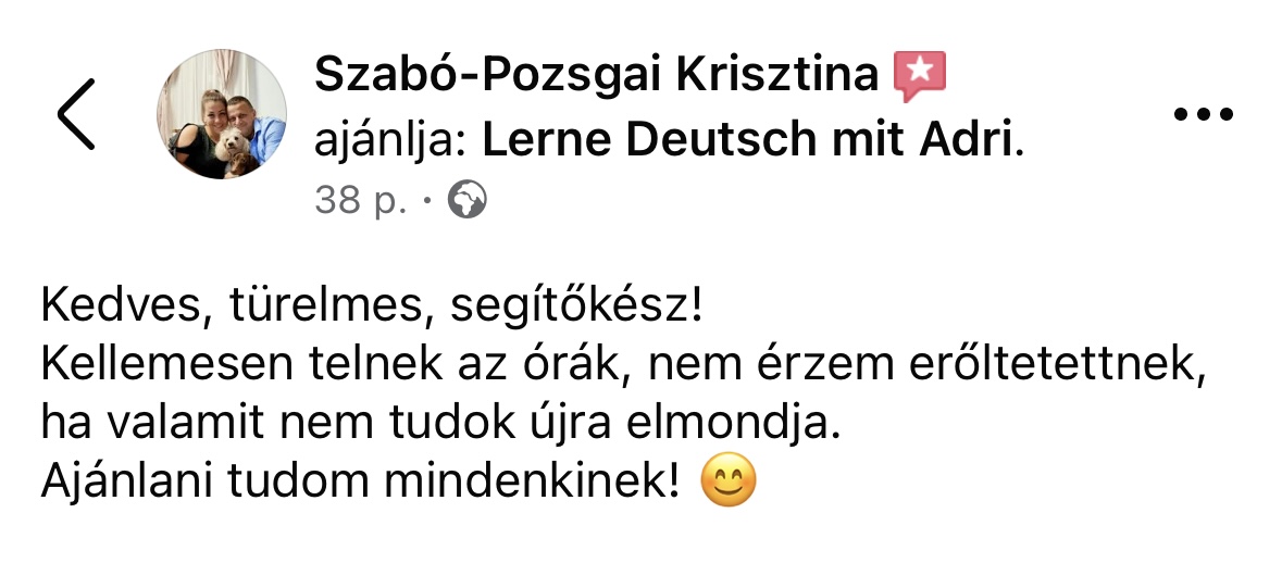 A legjobb visszajelzés mindig azoktól érkezik, akik már végigjárták az utat. Olvasd el, mit mondanak rólam azok, akik velem tanultak németül – hogyan segített nekik a közös munka, és milyen élmény volt számukra a tanulás. Lehet, hogy pont olyan kérdéseid voltak, mint nekik, és a válaszaikat náluk találod meg először.
