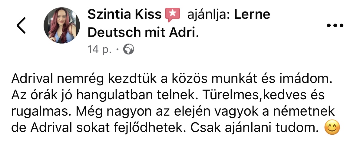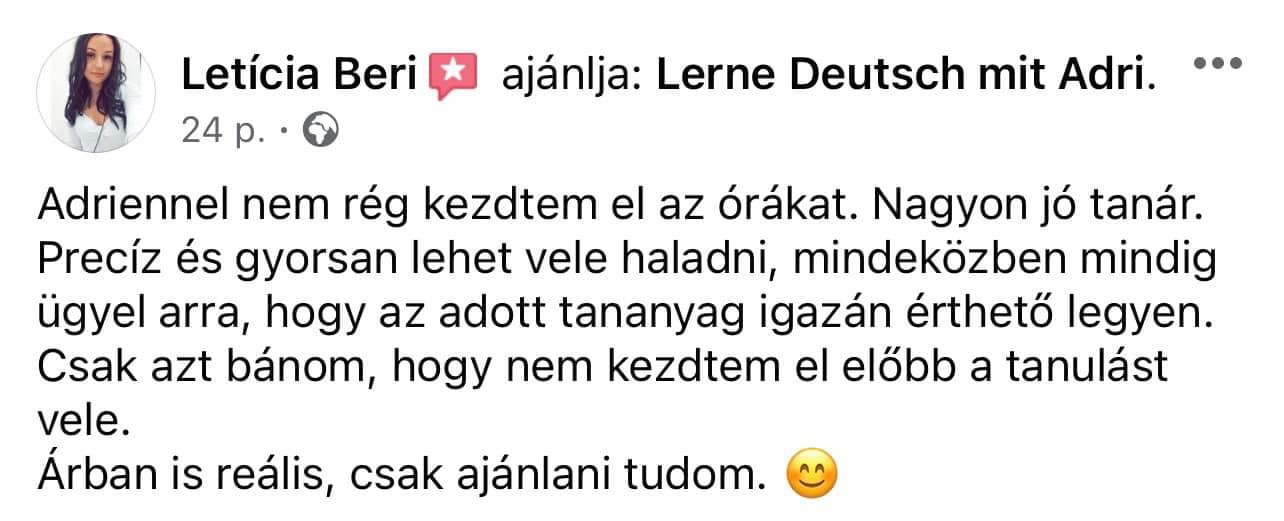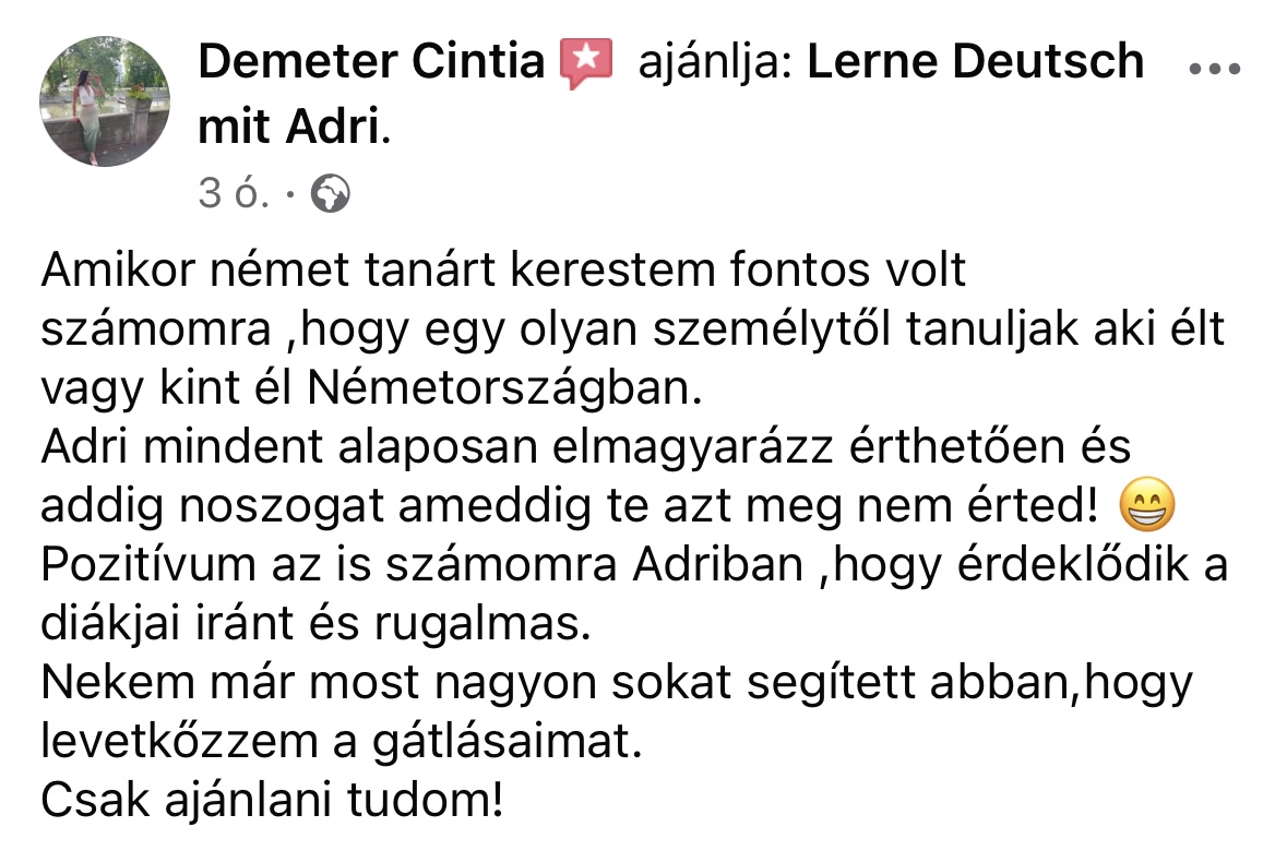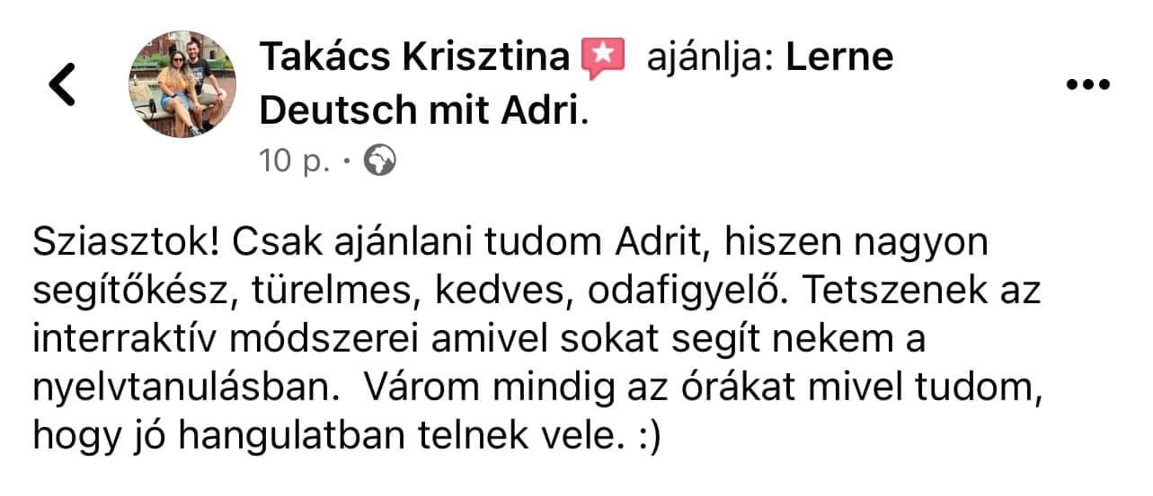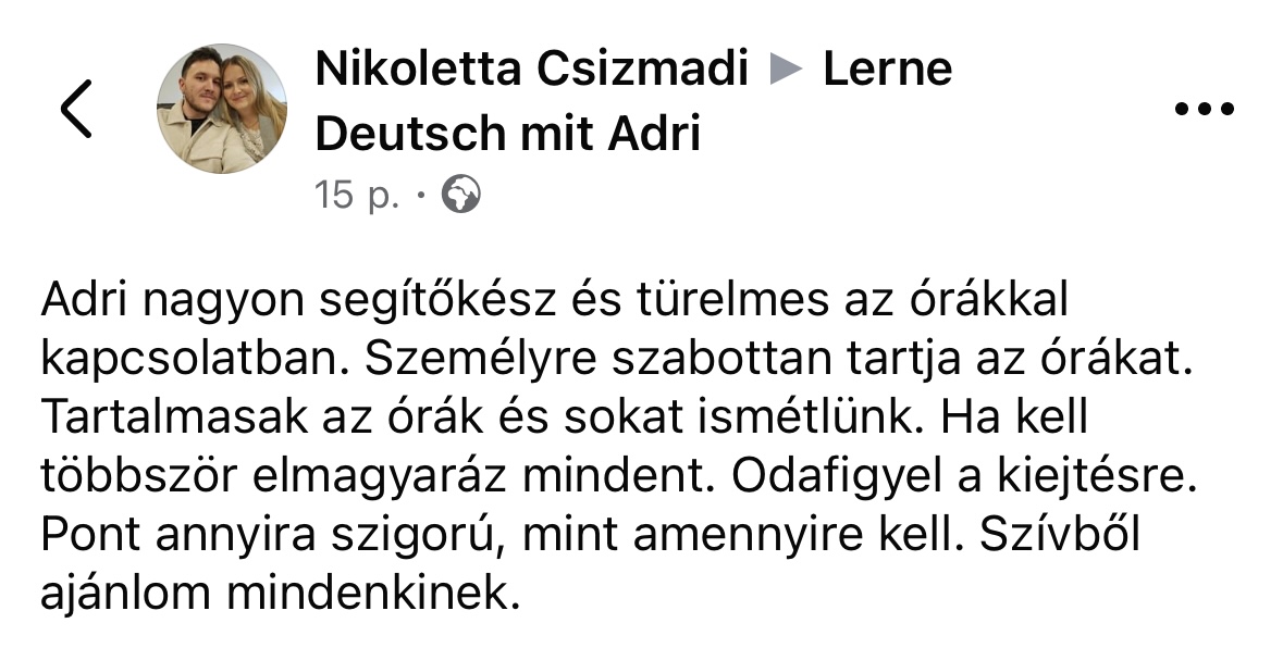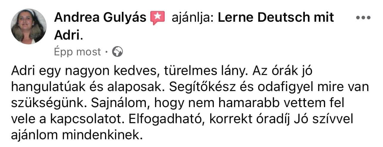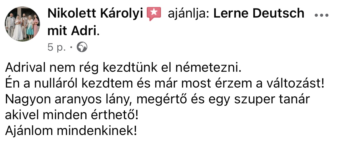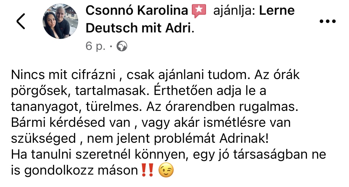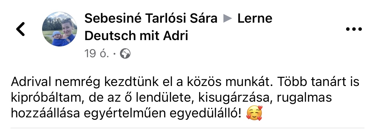 A legjobb visszajelzés mindig azoktól érkezik, akik már végigjárták az utat. Olvasd el, mit mondanak rólam azok, akik velem tanultak németül – hogyan segített nekik a közös munka, és milyen élmény volt számukra a tanulás. Lehet, hogy pont olyan kérdéseid voltak, mint nekik, és a válaszaikat náluk találod meg először.