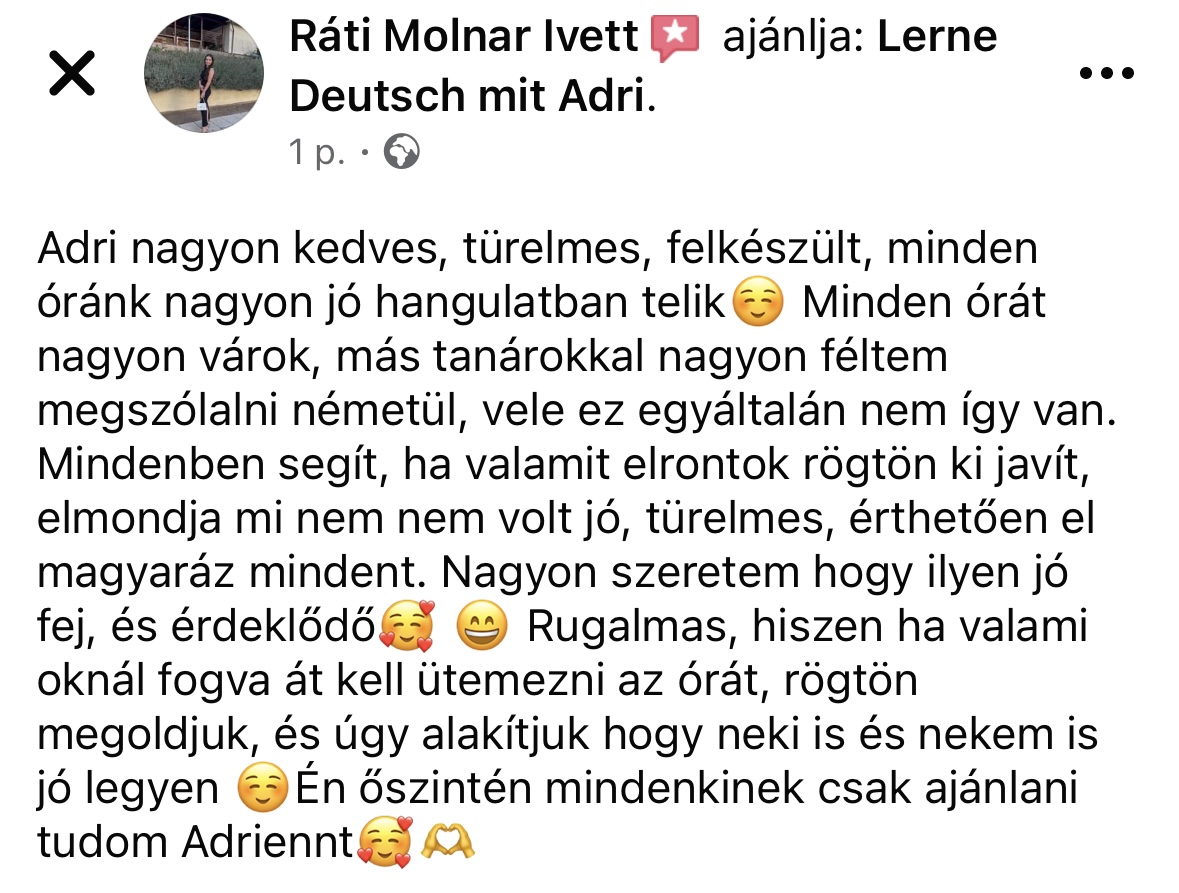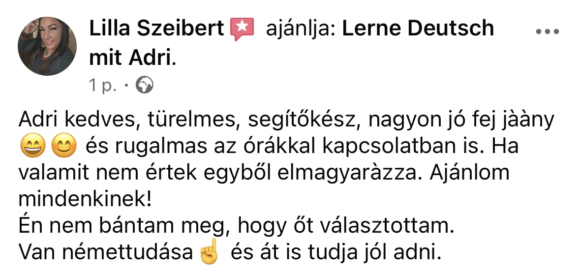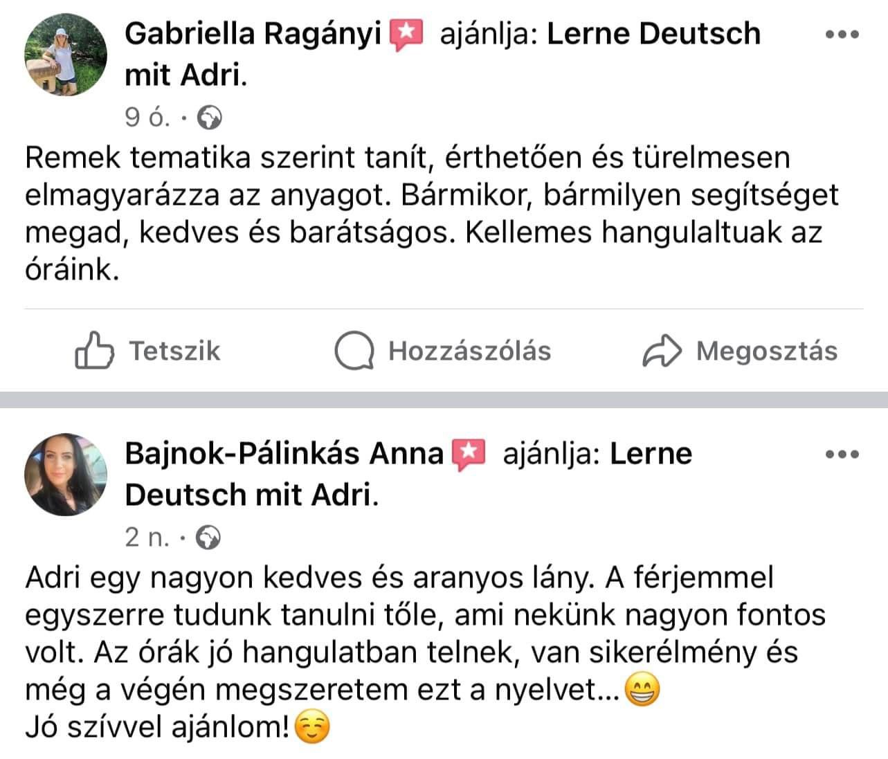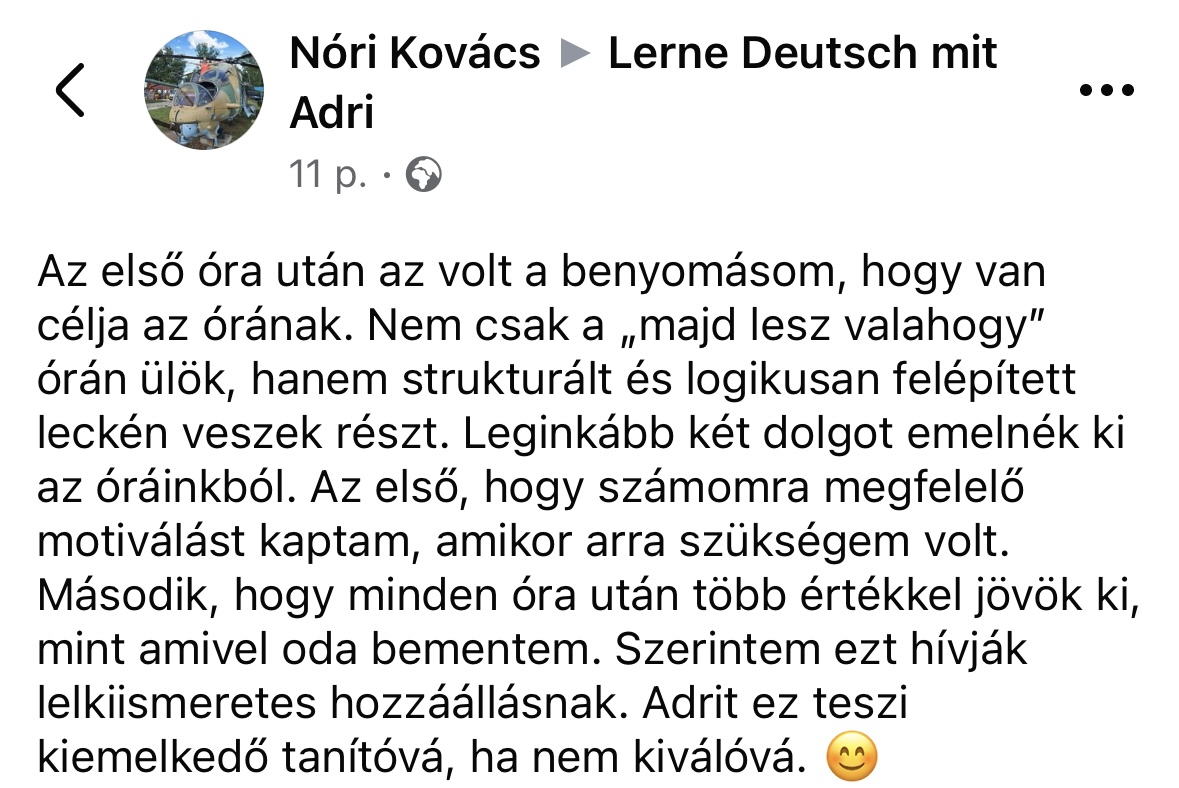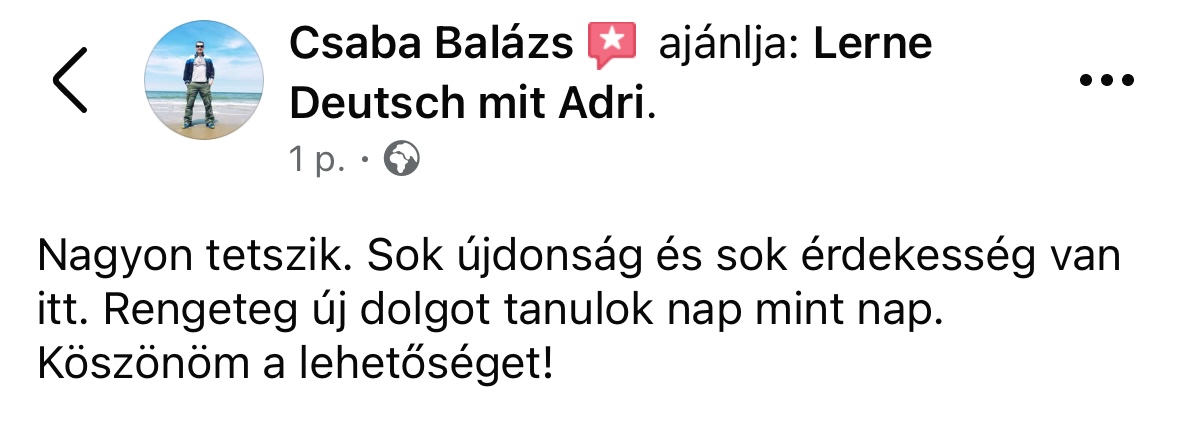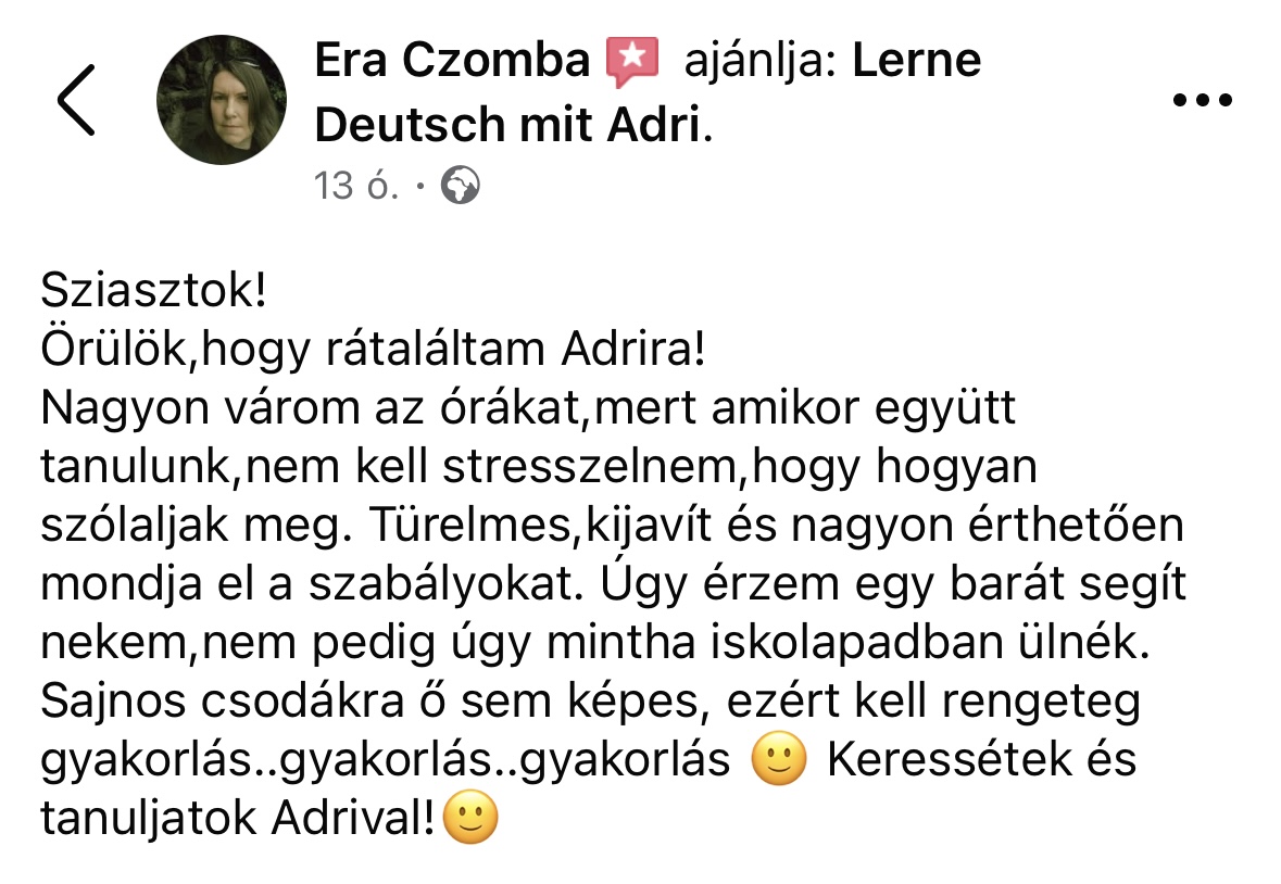 A legjobb visszajelzés mindig azoktól érkezik, akik már végigjárták az utat. Olvasd el, mit mondanak rólam azok, akik velem tanultak németül – hogyan segített nekik a közös munka, és milyen élmény volt számukra a tanulás. Lehet, hogy pont olyan kérdéseid voltak, mint nekik, és a válaszaikat náluk találod meg először.