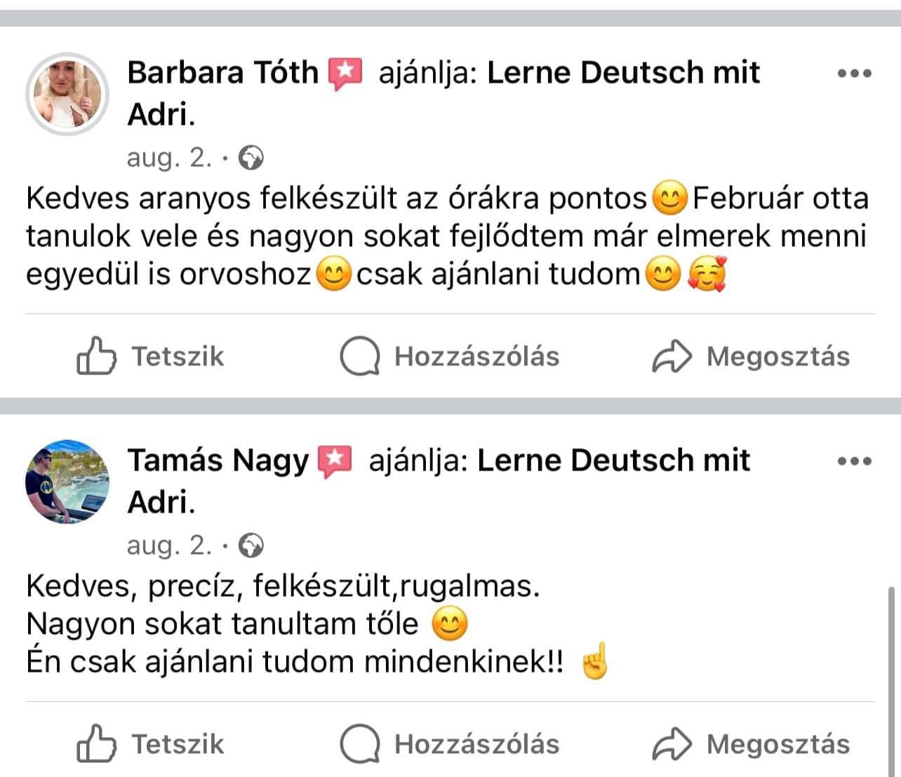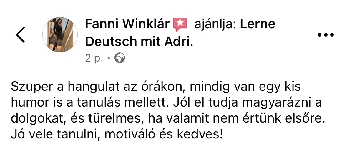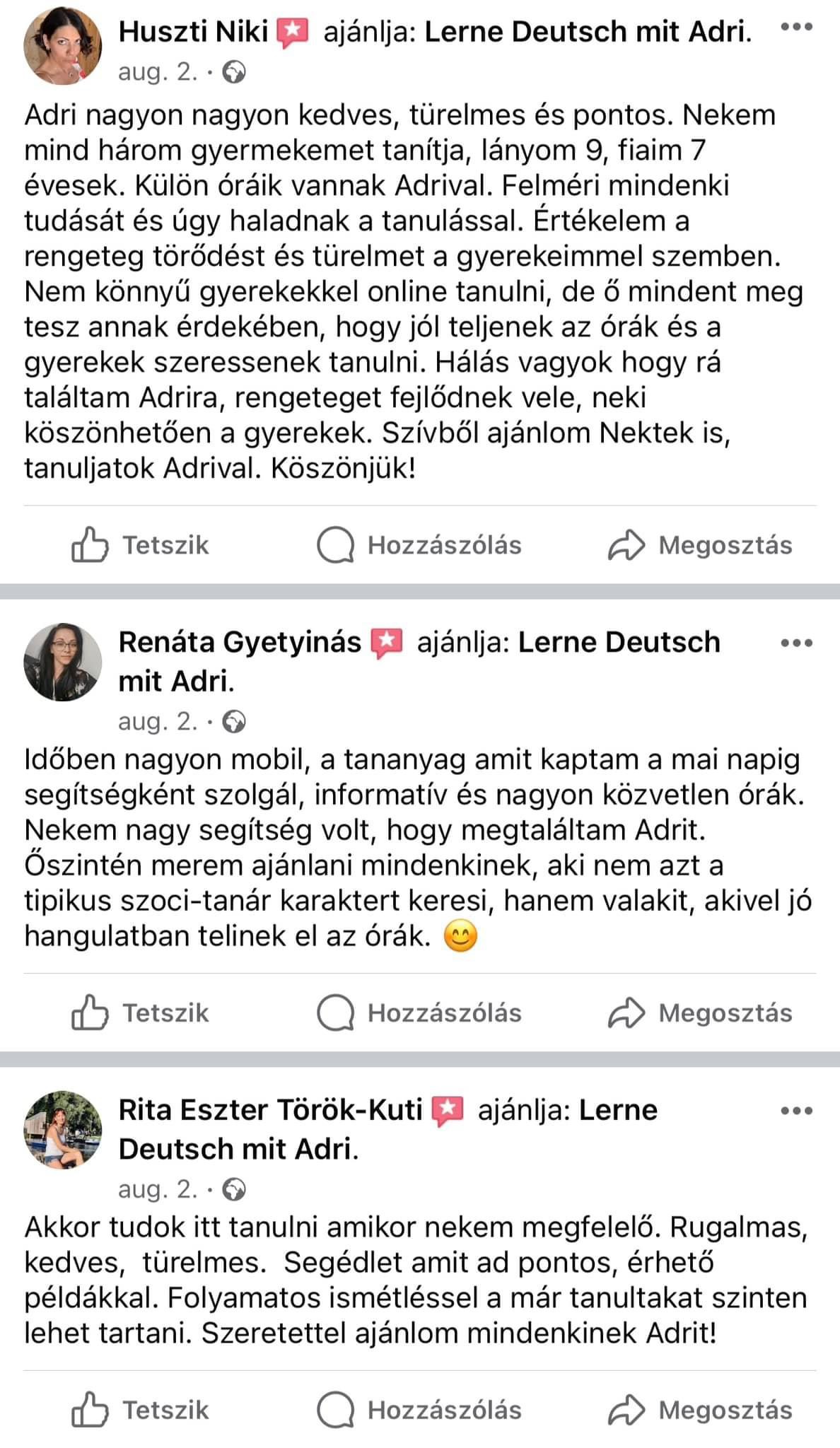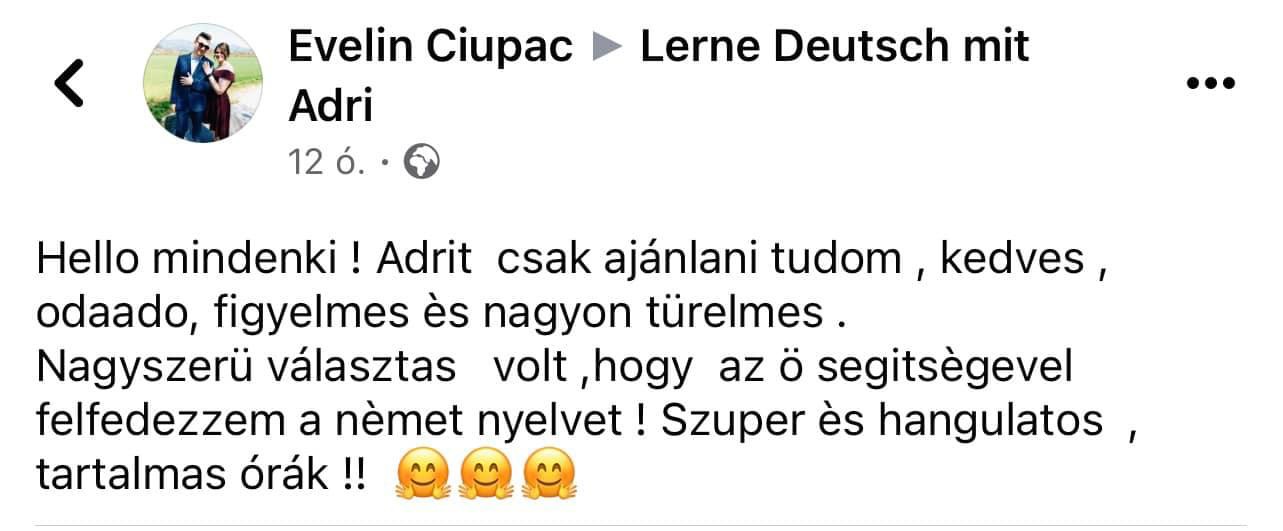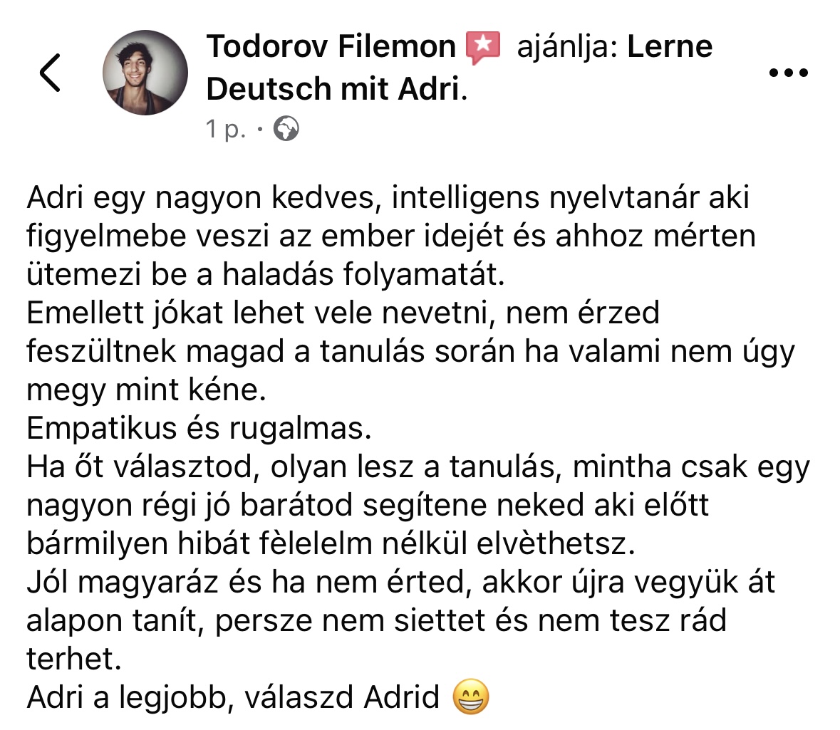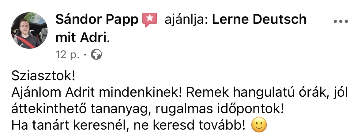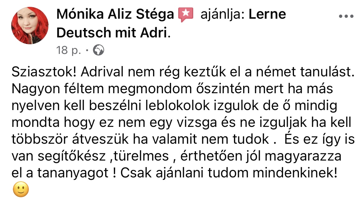 A legjobb visszajelzés mindig azoktól érkezik, akik már végigjárták az utat. Olvasd el, mit mondanak rólam azok, akik velem tanultak németül – hogyan segített nekik a közös munka, és milyen élmény volt számukra a tanulás. Lehet, hogy pont olyan kérdéseid voltak, mint nekik, és a válaszaikat náluk találod meg először.