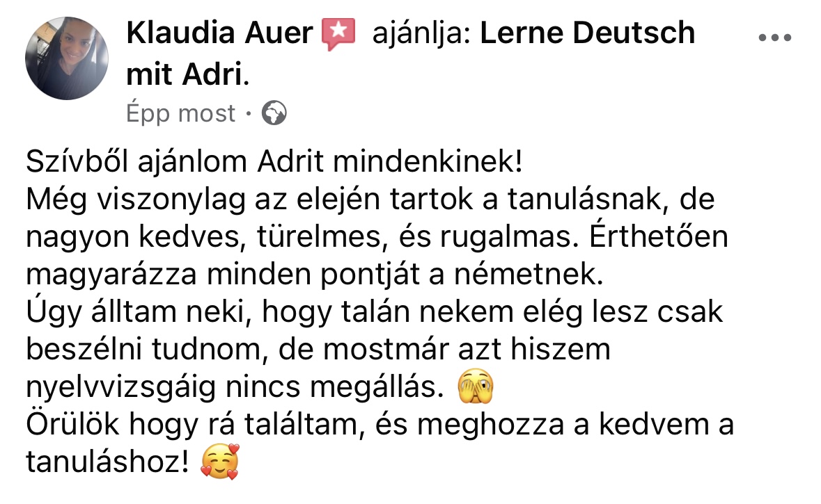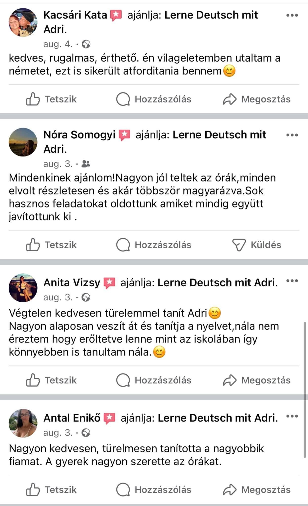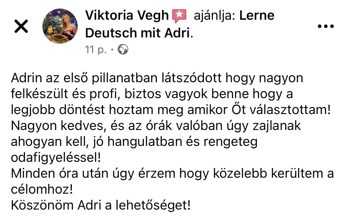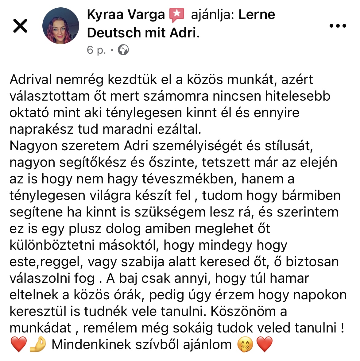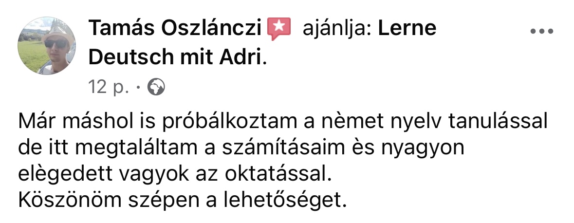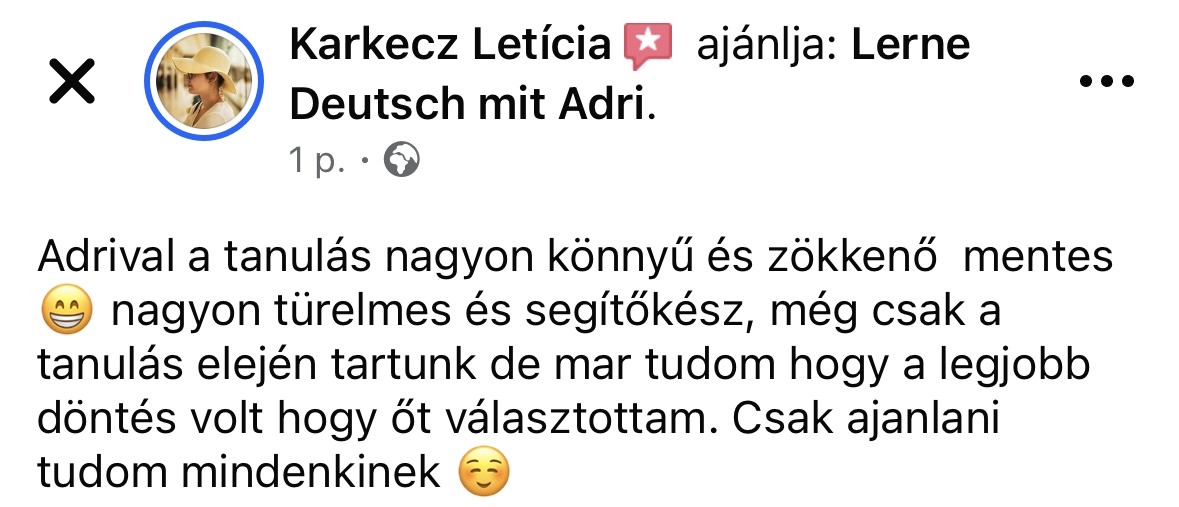 A legjobb visszajelzés mindig azoktól érkezik, akik már végigjárták az utat. Olvasd el, mit mondanak rólam azok, akik velem tanultak németül – hogyan segített nekik a közös munka, és milyen élmény volt számukra a tanulás. Lehet, hogy pont olyan kérdéseid voltak, mint nekik, és a válaszaikat náluk találod meg először.