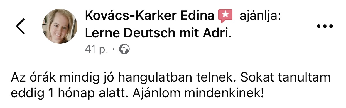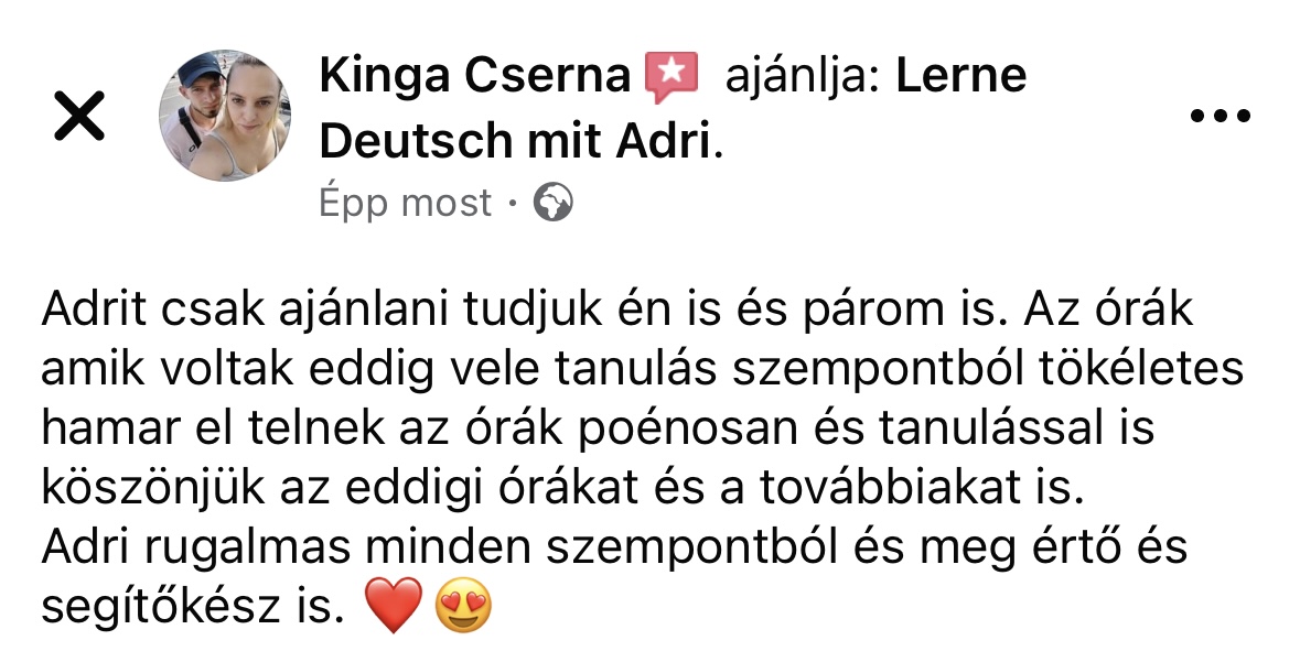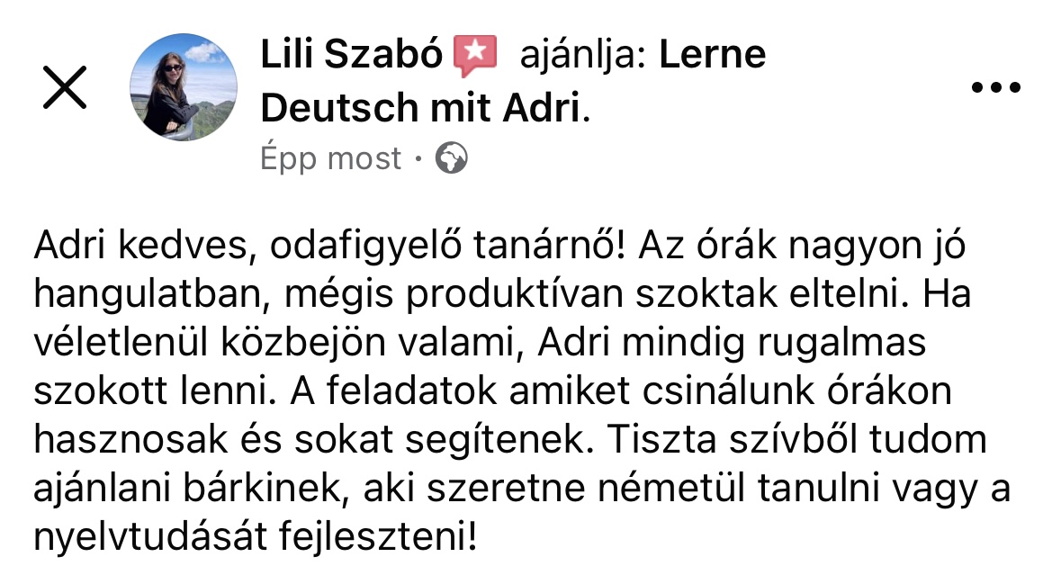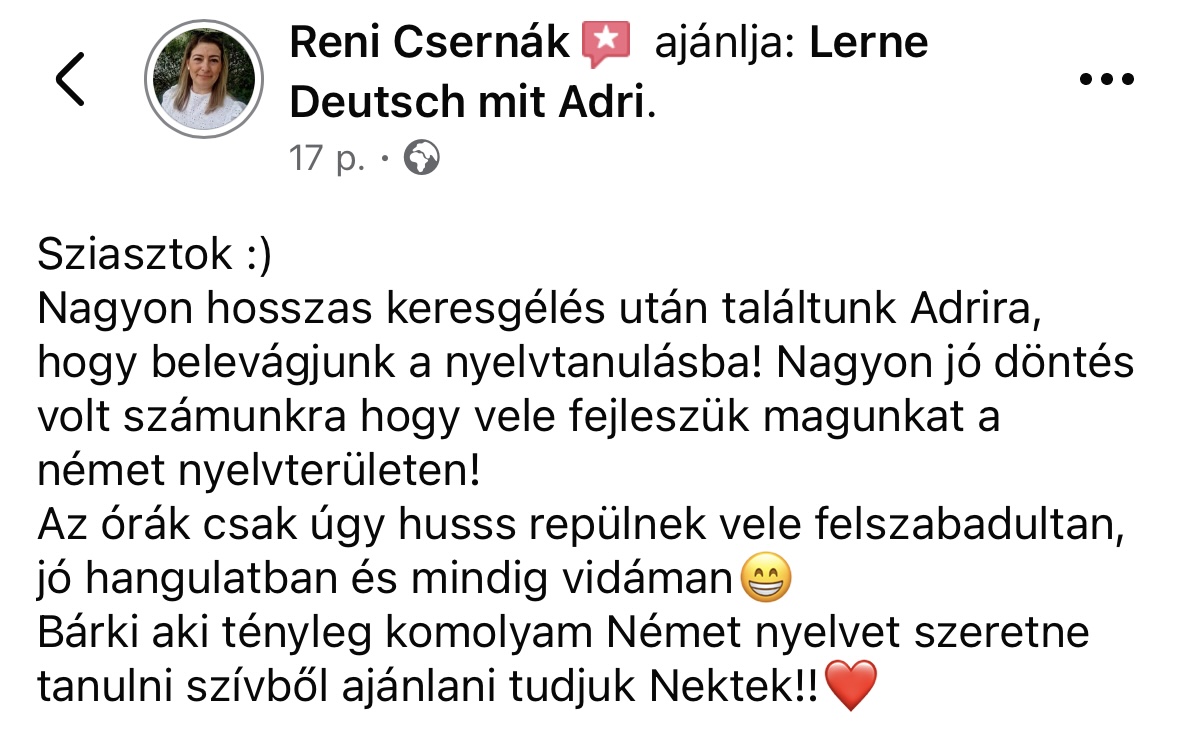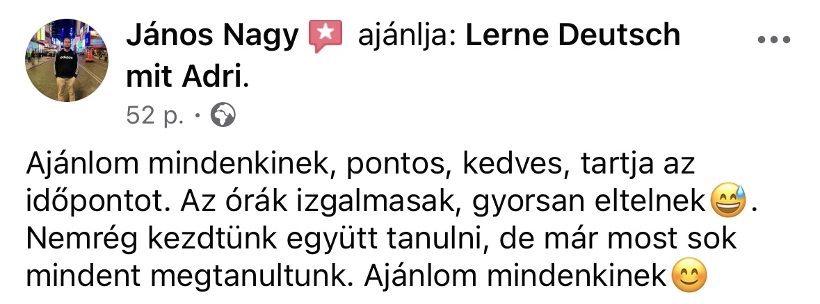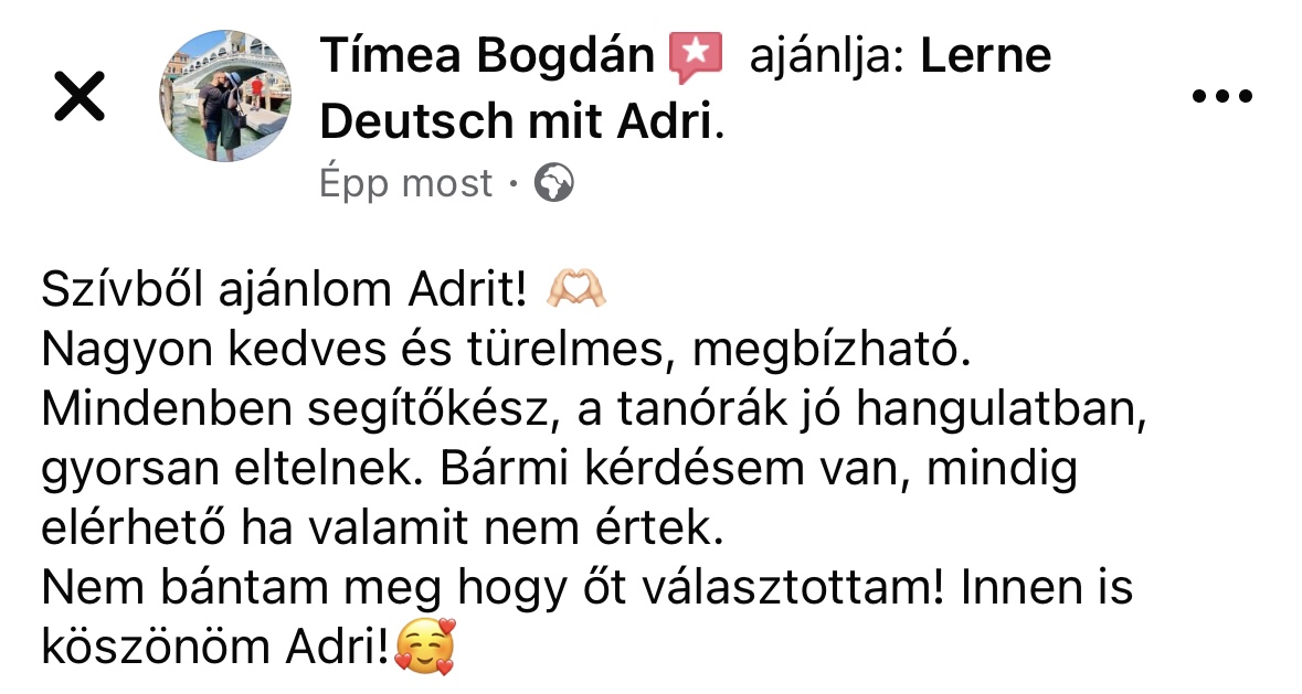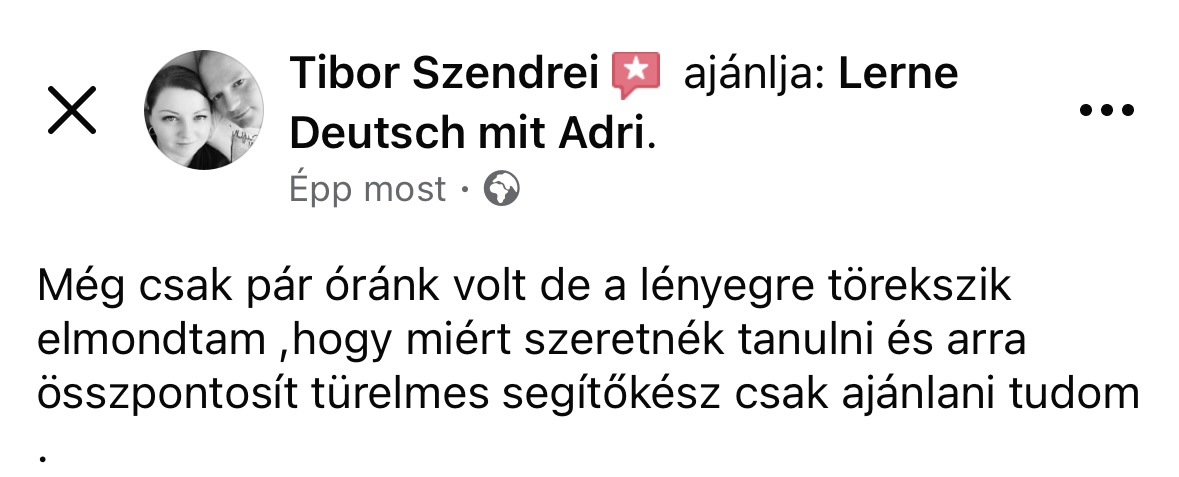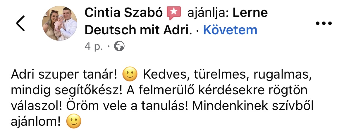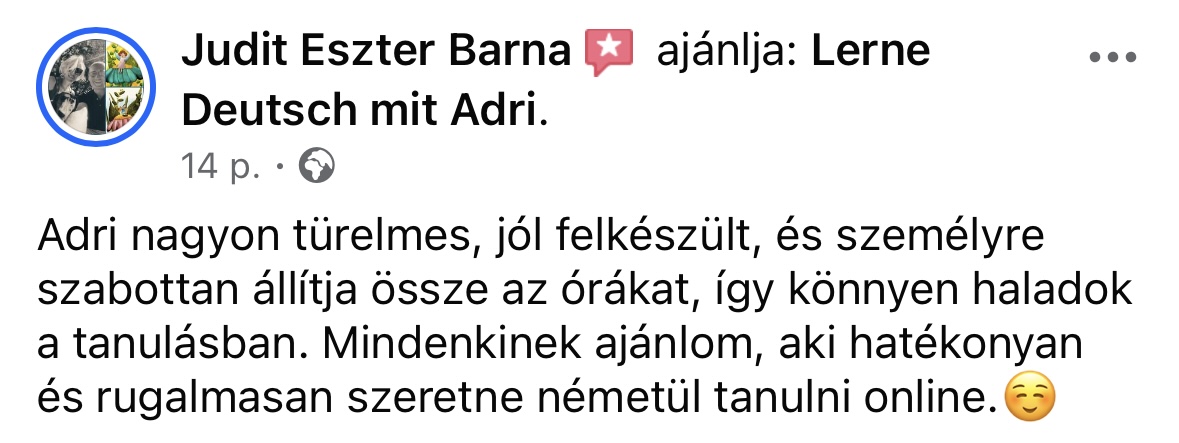 A legjobb visszajelzés mindig azoktól érkezik, akik már végigjárták az utat. Olvasd el, mit mondanak rólam azok, akik velem tanultak németül – hogyan segített nekik a közös munka, és milyen élmény volt számukra a tanulás. Lehet, hogy pont olyan kérdéseid voltak, mint nekik, és a válaszaikat náluk találod meg először.