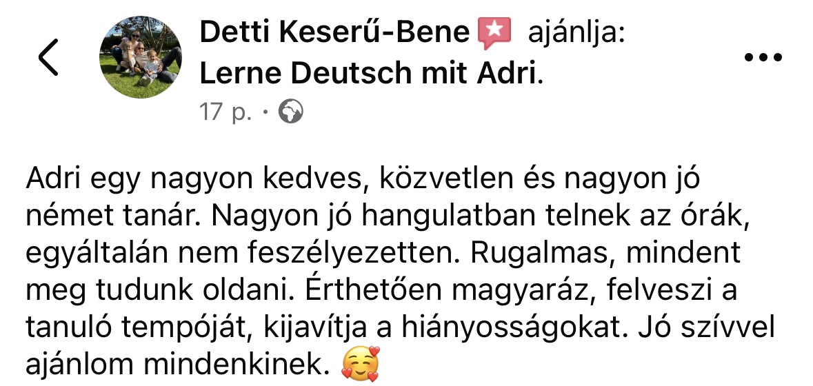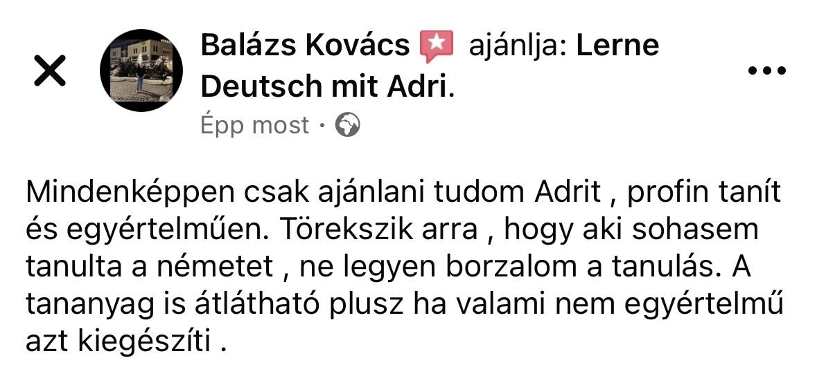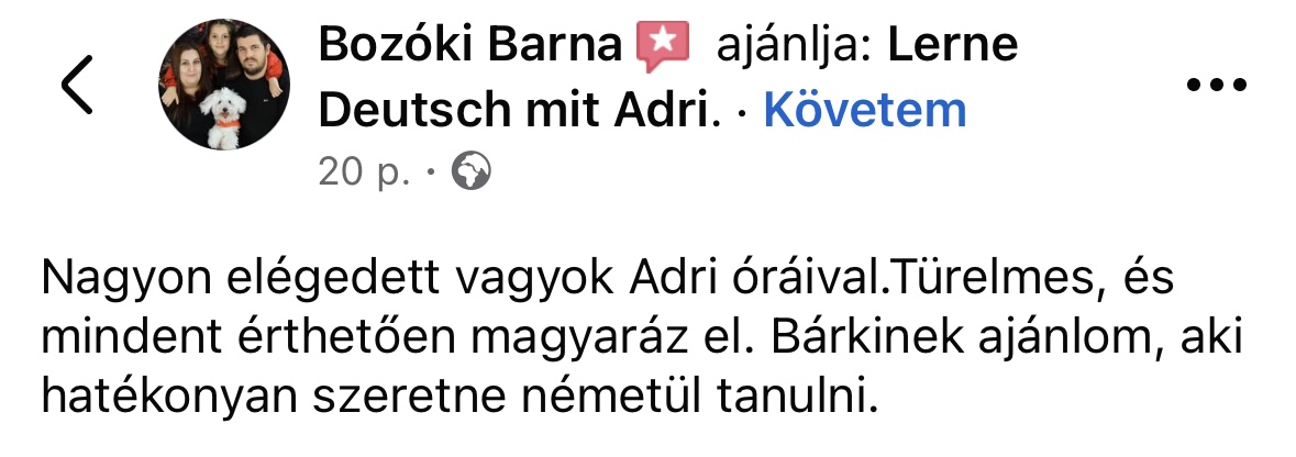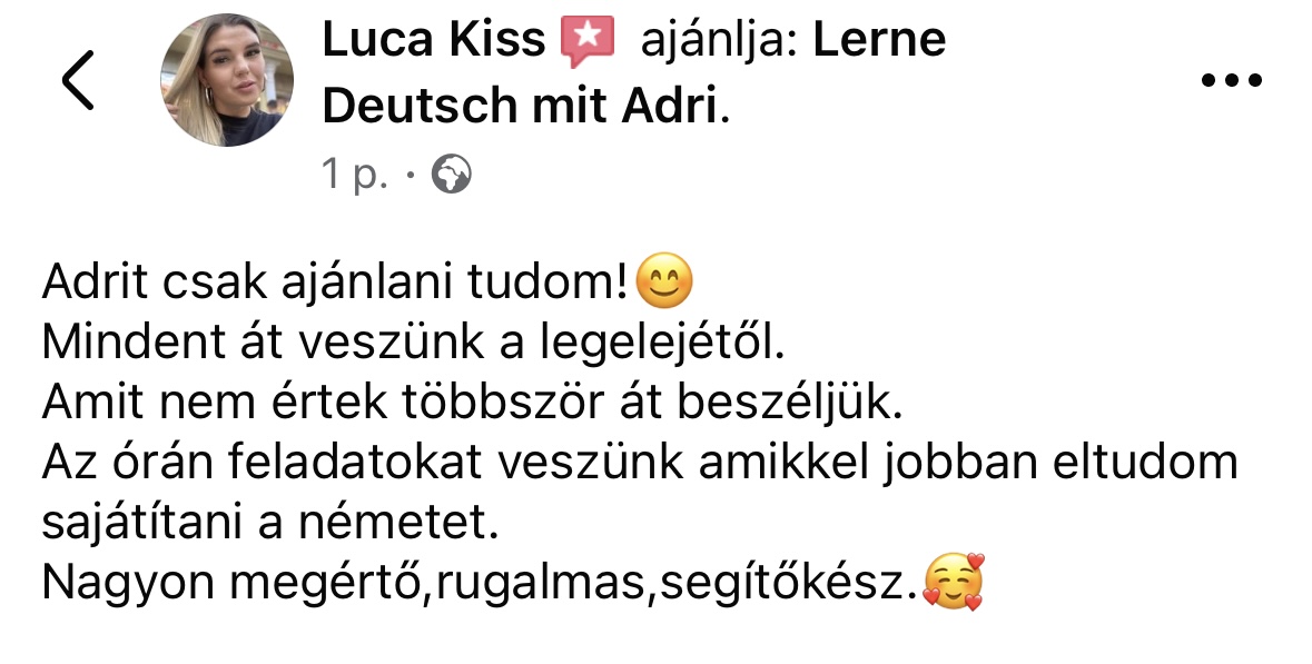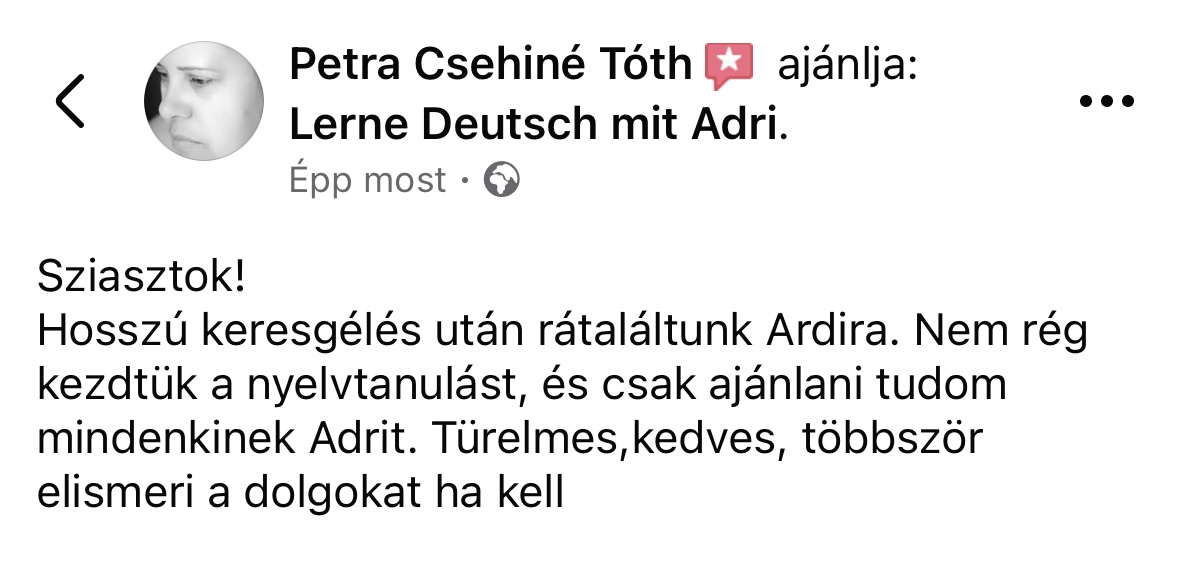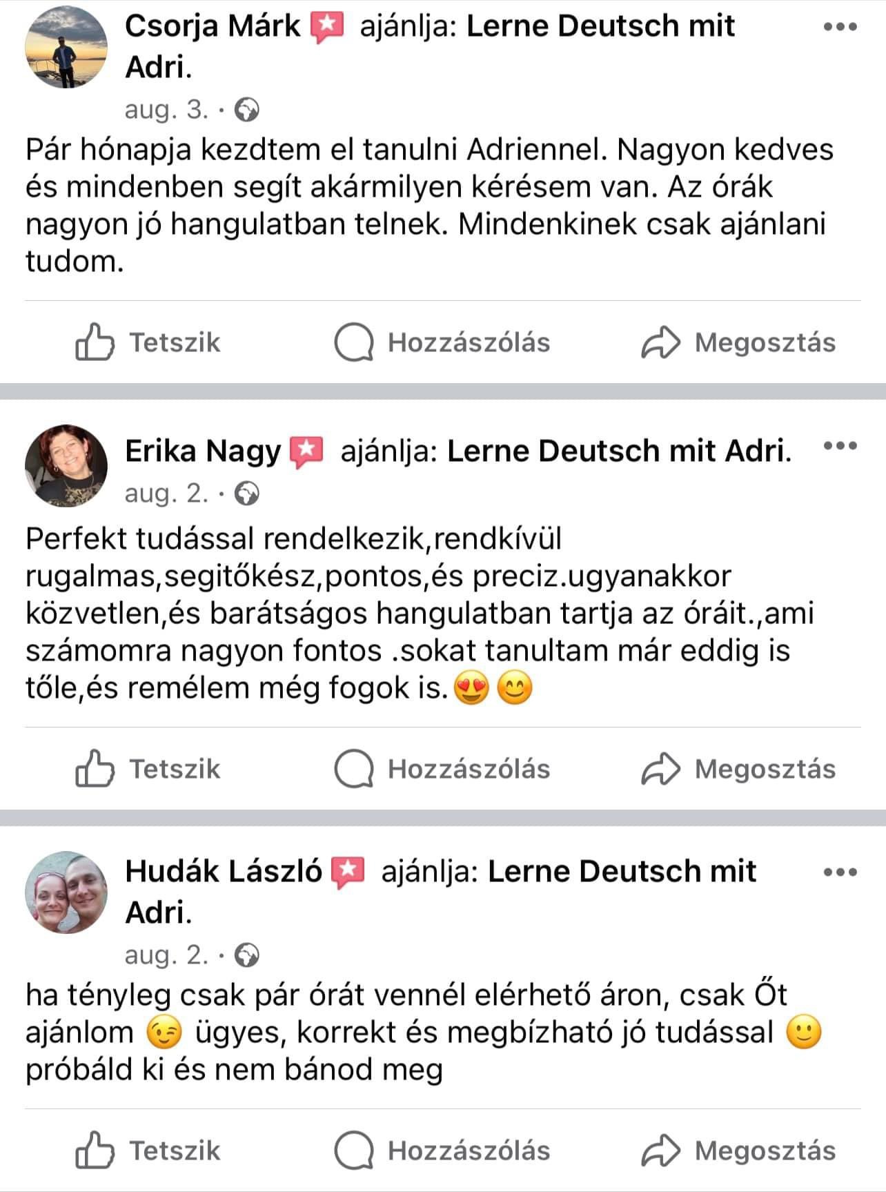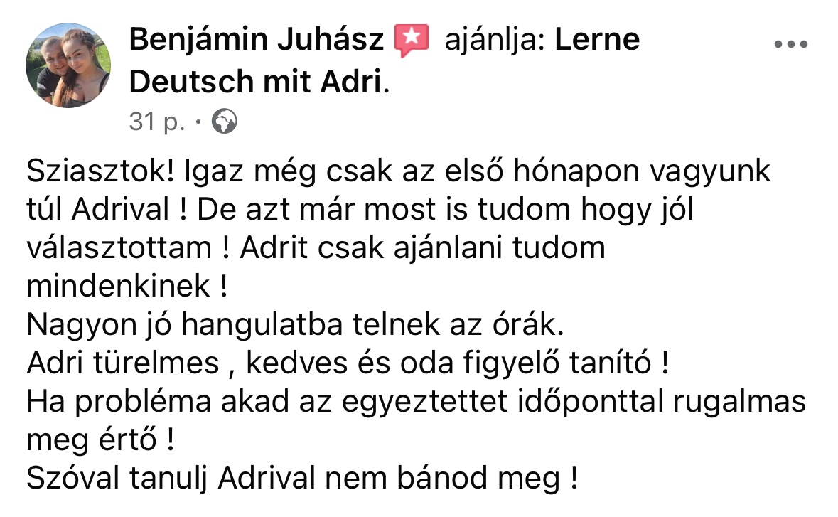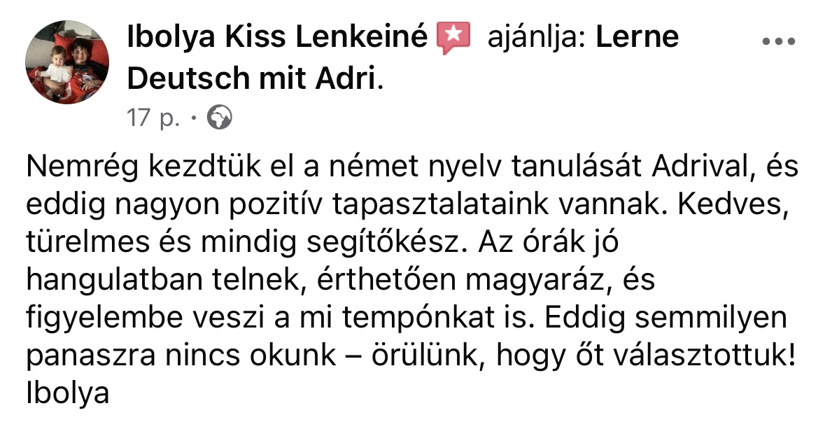 A legjobb visszajelzés mindig azoktól érkezik, akik már végigjárták az utat. Olvasd el, mit mondanak rólam azok, akik velem tanultak németül – hogyan segített nekik a közös munka, és milyen élmény volt számukra a tanulás. Lehet, hogy pont olyan kérdéseid voltak, mint nekik, és a válaszaikat náluk találod meg először.