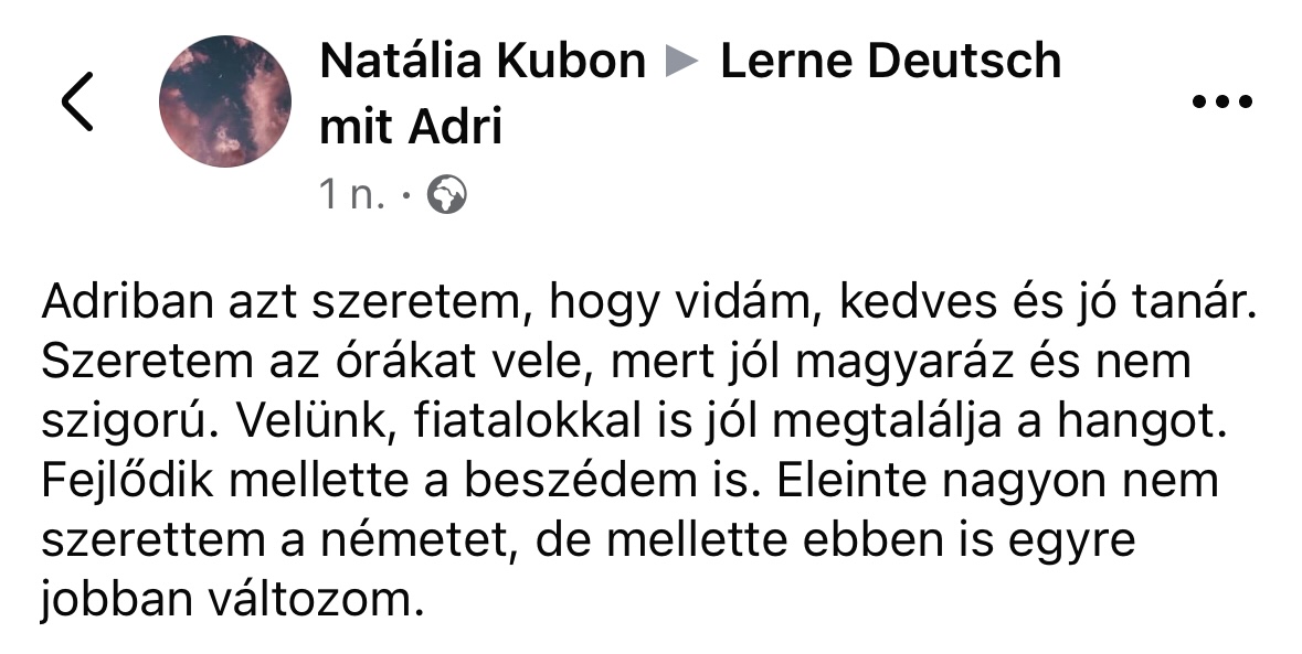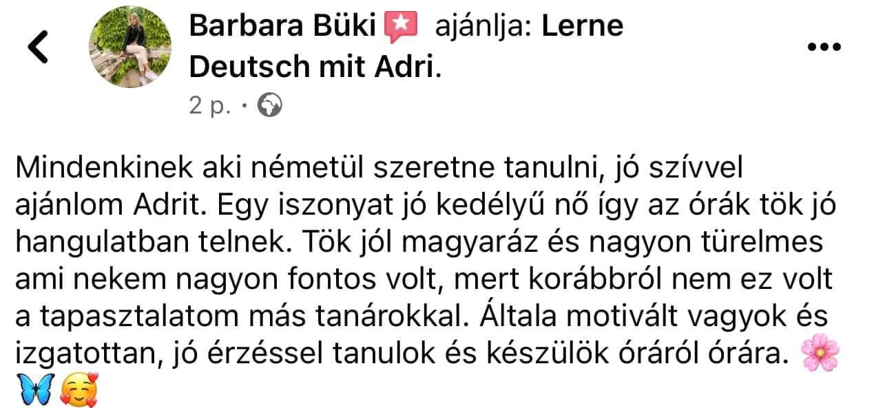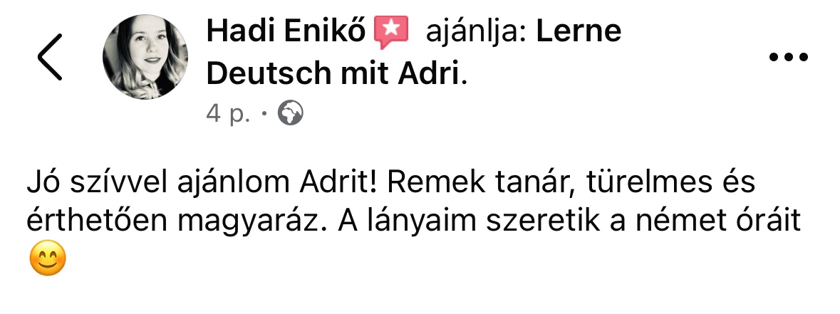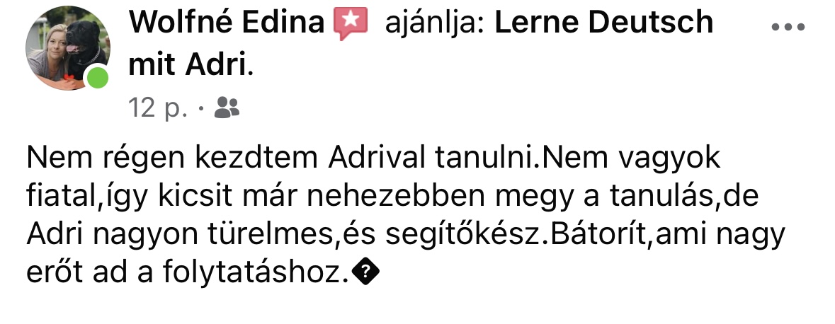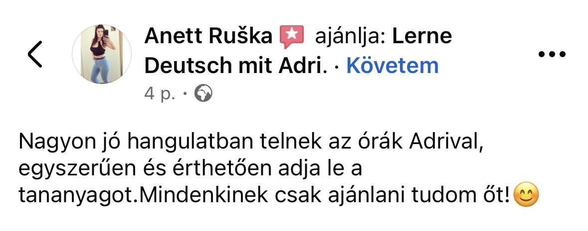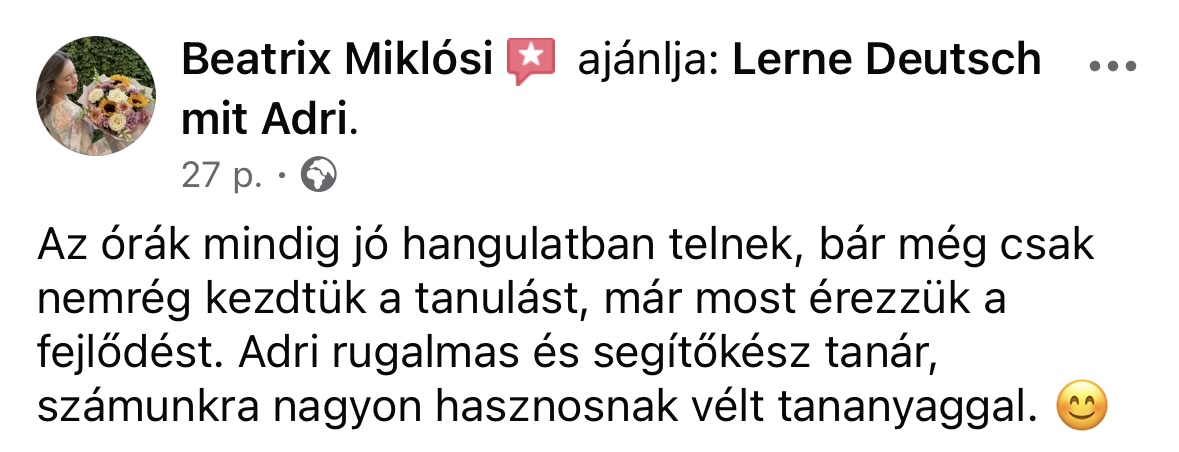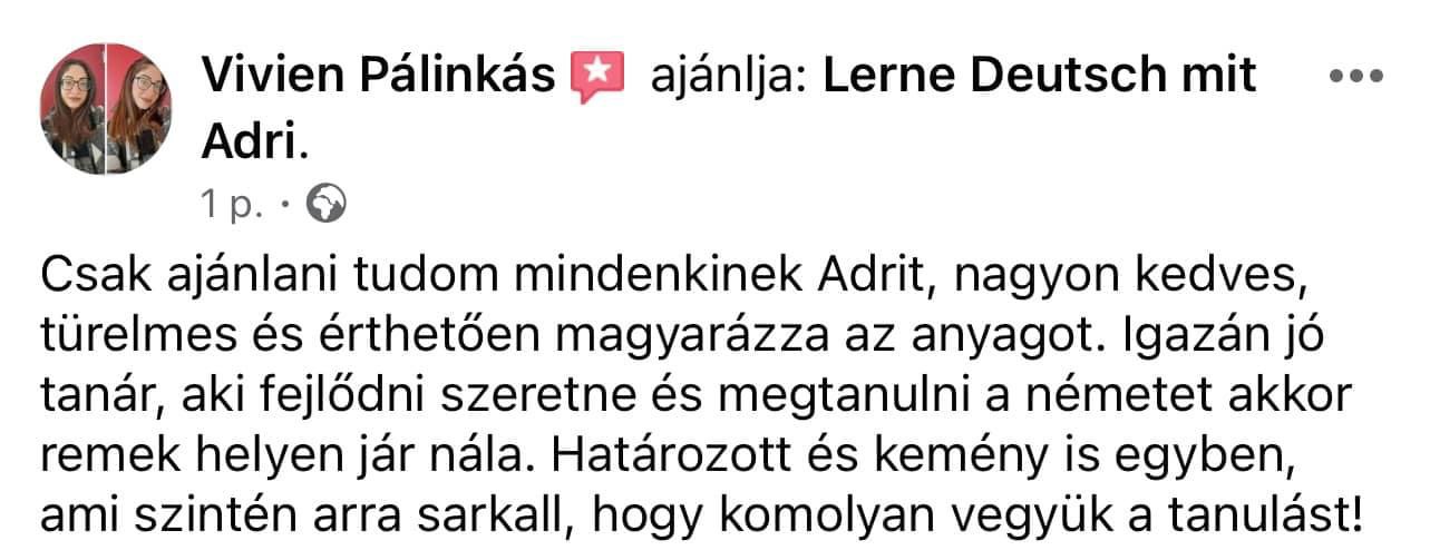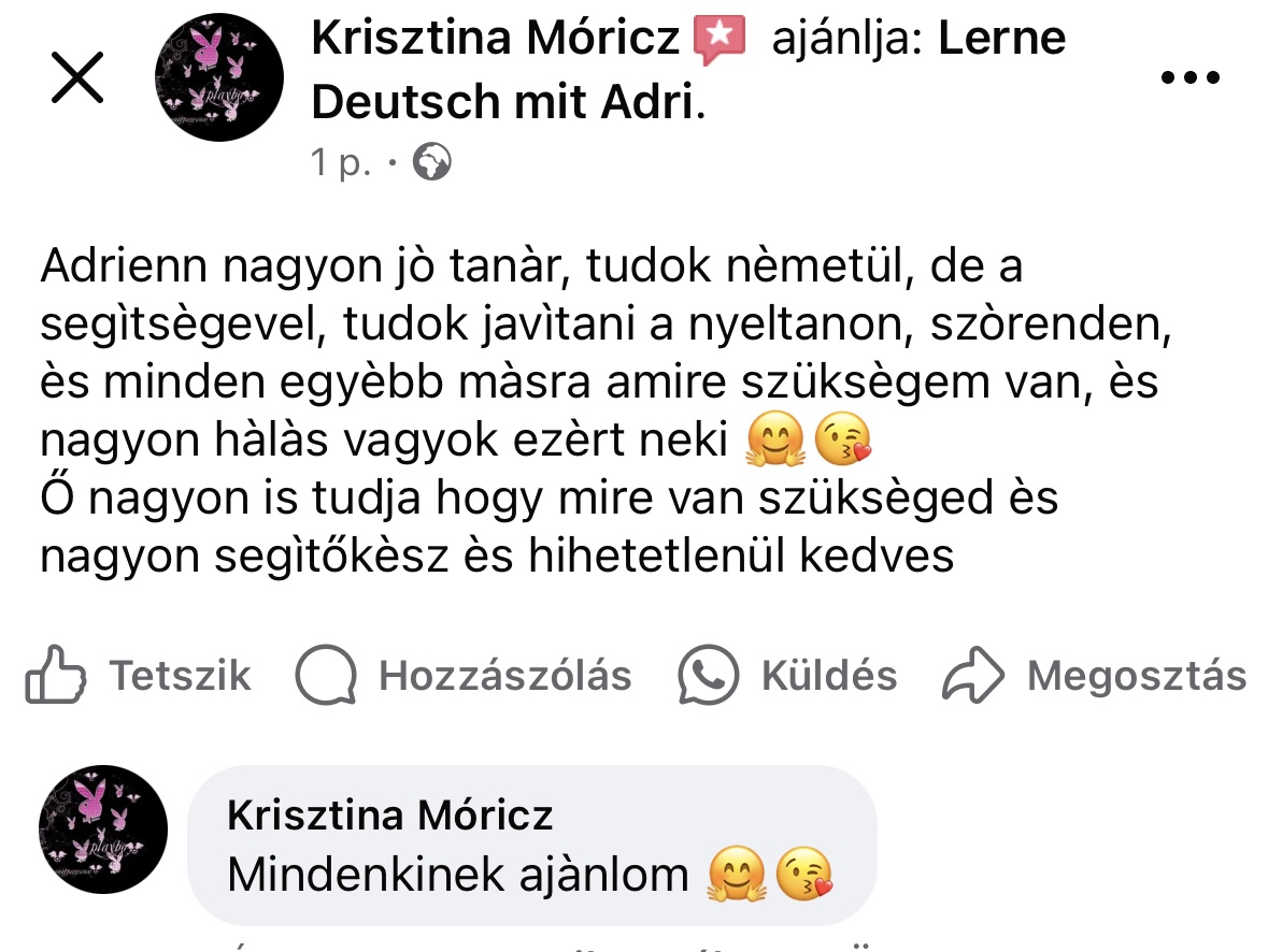 A legjobb visszajelzés mindig azoktól érkezik, akik már végigjárták az utat. Olvasd el, mit mondanak rólam azok, akik velem tanultak németül – hogyan segített nekik a közös munka, és milyen élmény volt számukra a tanulás. Lehet, hogy pont olyan kérdéseid voltak, mint nekik, és a válaszaikat náluk találod meg először.